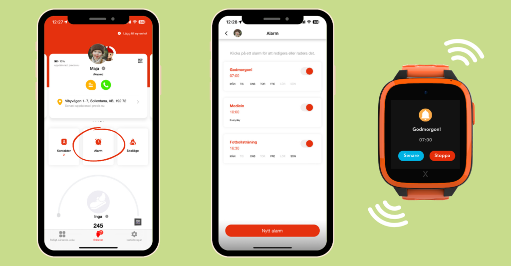 I Xploras föräldraapp kan du ställa in och hantera användningen av ditt barns Xplora. Via appen får du aviseringar om aktivitet, samt bestämmer barnets kontakter, alarm, skolläge och trygghetszoner. Låt oss gå igenom de olika funktionerna som visas i appen!