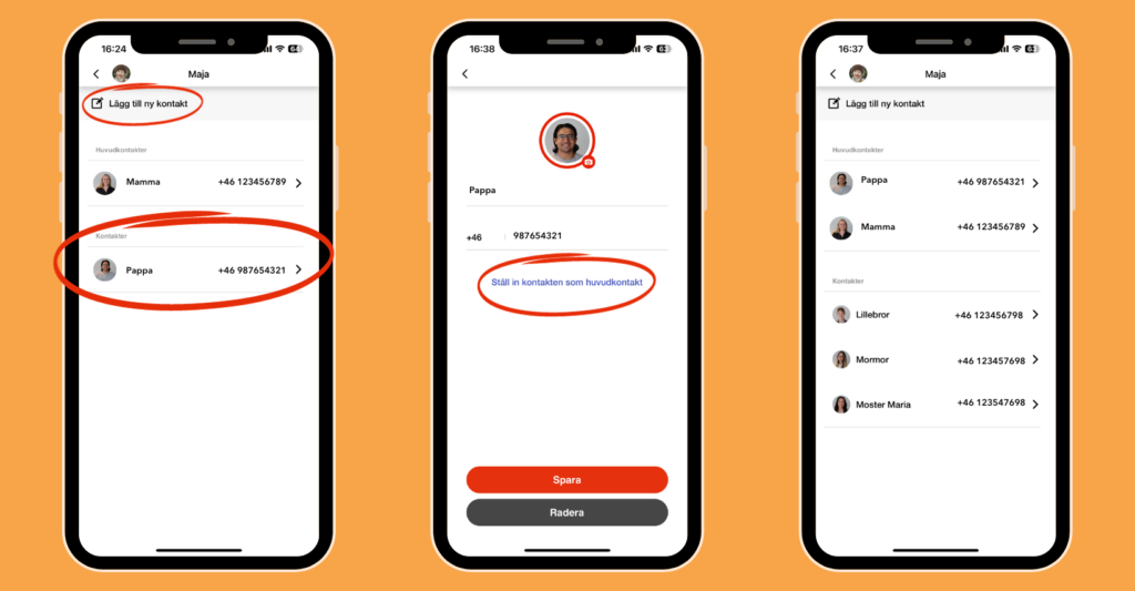Huvudkontakter: Den person som först kopplar klockan till appen blir automatiskt den första huvudkontakten. Denna person kan även lägga till ytterligare en huvudkontakt som kan styra klockan (max 2 st).