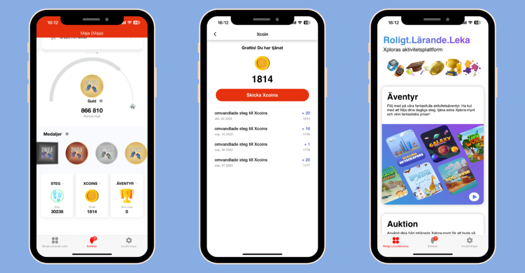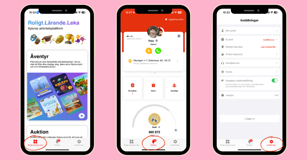 Under kugghjulet längst ner till höger i appen kan du ställa in dina egna profilinställningar som e-post, telefonnummer, lösenord, namn, få support via Xploras hemsida och se användarvillkor och sekretessinställningar. Under ikonen längst ner till vänster kan du anmäla både dig själv och dina barn till Xploras aktivitetsplattforms äventyr där du kan vinna coola priser och tjäna massor av Xplora-mynt, som kan användas i Marknadsplatsen, Xploras egen digitala butik och auktion. Här får du också de senaste nyheterna från Xplora samt fina erbjudanden och möjligheten att gå in i Xplora Arkad och spela massor av roliga spel!