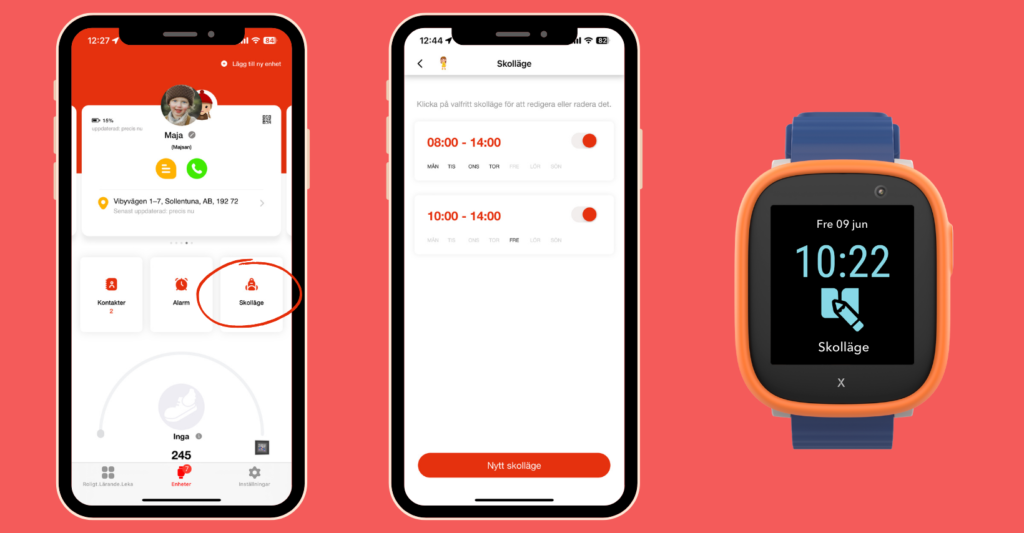 För att barnen ska kunna använda klockan i skolan, behöver funktionen Skolläge aktiveras. Detta gör du som huvudkontakt av klockan enkelt via vår app. När skolläget är aktiverat stängs alla klockans funktioner av och den fungerar enbart som en klocka. Stegräknaren fungerar men barnet kan inte se hur många steg hen har tagit under dagen. Observera att funktionen SOS alltid fungerar ifall barnen behöver komma i kontakt med er. Ifall du som förälder behöver kontakta barnet under skoltid, stänger du enkelt av skolläget i appen så kan du ringa/skicka meddelanden till klockan.