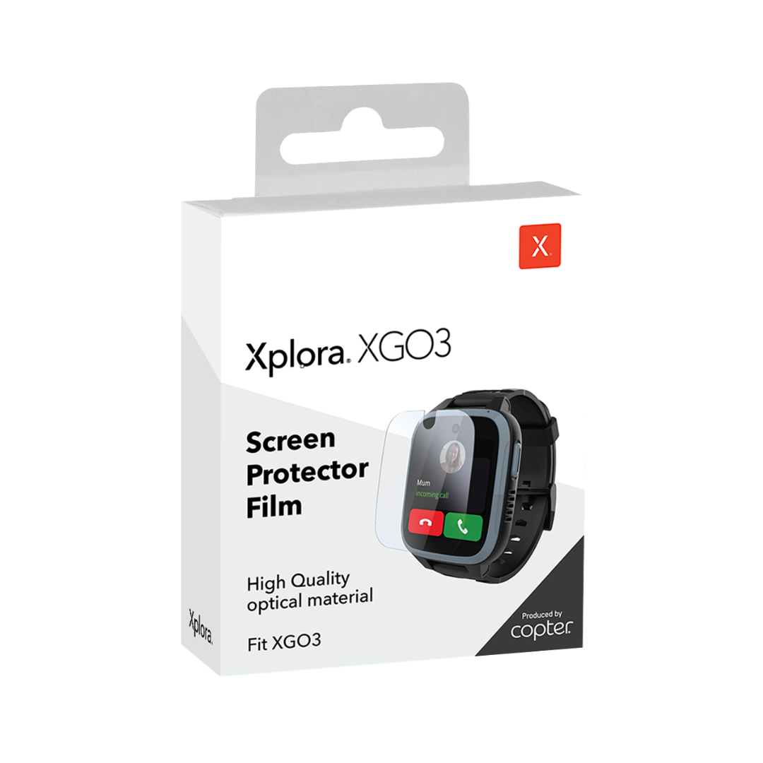 Ett genomskinligt skärmskydd till Xplora XGO3 som gör mobilklockan mer tålig så att den håller längre.